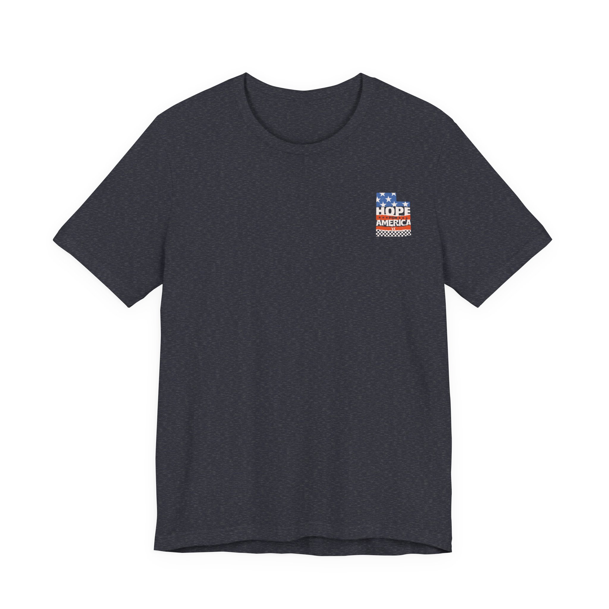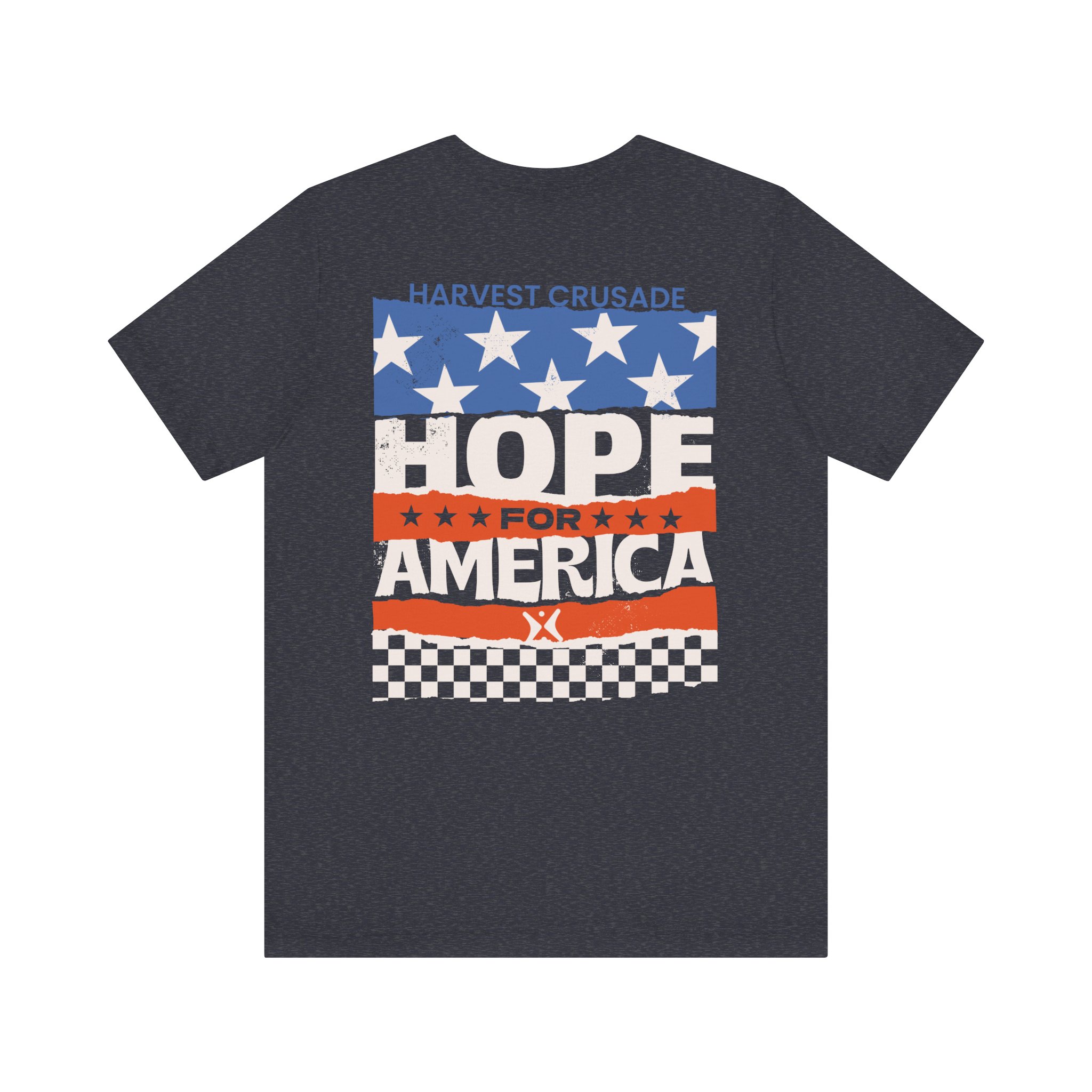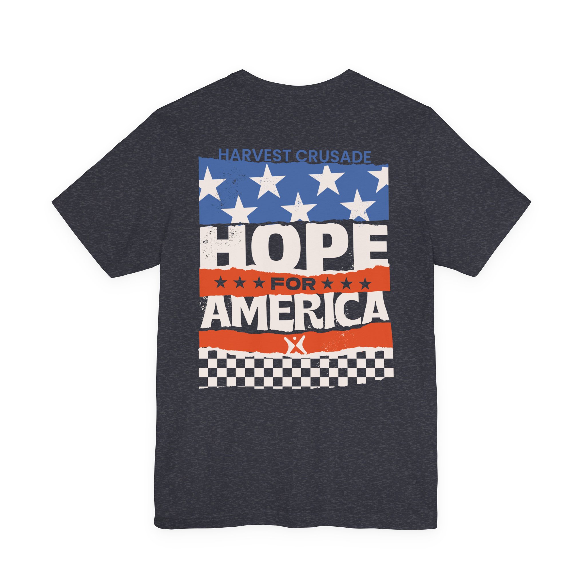 This lightweight cotton tee carries quiet, earnest patriotism — a soft white canvas with a small chest emblem and a bold, weathered flag graphic across the back reading “Harvest Crusade • Hope for America.” It feels lived-in from the first wear: breathable Airlume combed cotton that layers easily under a jacket or stands on its own on warm nights. The retail fit and crew neckline keep the look neat and approachable, while reinforced shoulder tape and side seams ensure it keeps shape through repeated wear. For people who show faith and civic hope through their wardrobe, this shirt speaks with subtlety in front and with proud, vintage-inspired graphics on the back.