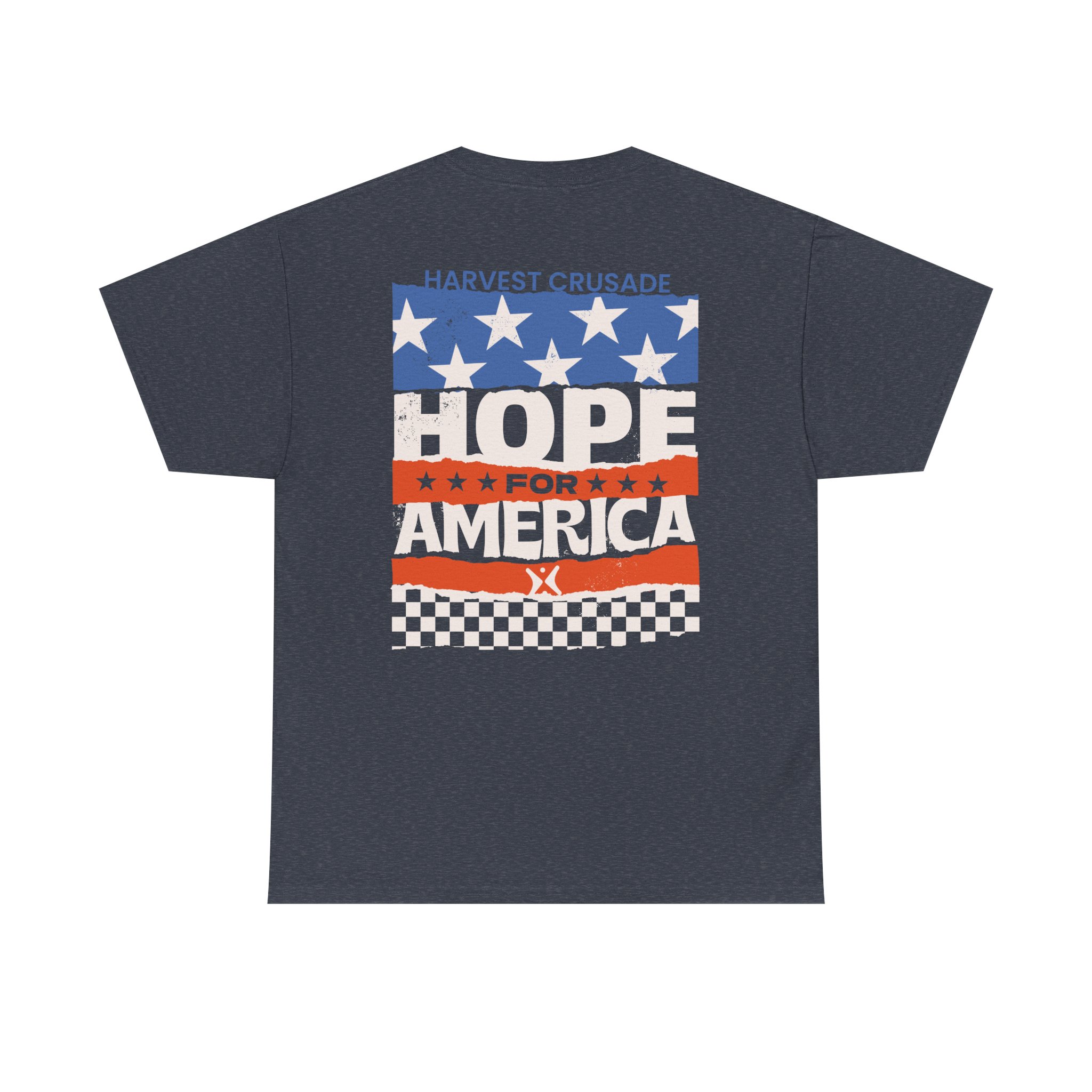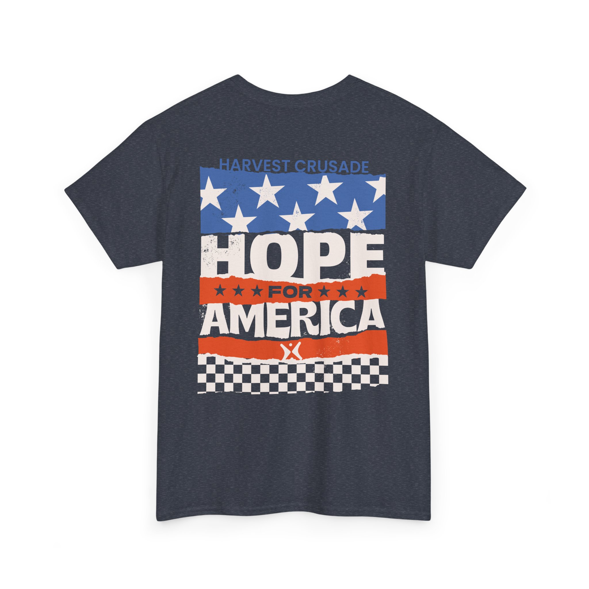 This lightweight cotton tee carries quiet, earnest patriotism — a soft white canvas with a small chest emblem and a bold, weathered flag graphic across the back reading “Harvest Crusade • Hope for America.” It feels lived-in from the first wear: breathable Airlume combed cotton that layers easily under a jacket or stands on its own on warm nights. The retail fit and crew neckline keep the look neat and approachable, while reinforced shoulder tape and side seams ensure it keeps shape through repeated wear. For people who show faith and civic hope through their wardrobe, this shirt speaks with subtlety in front and with proud, vintage-inspired graphics on the back.